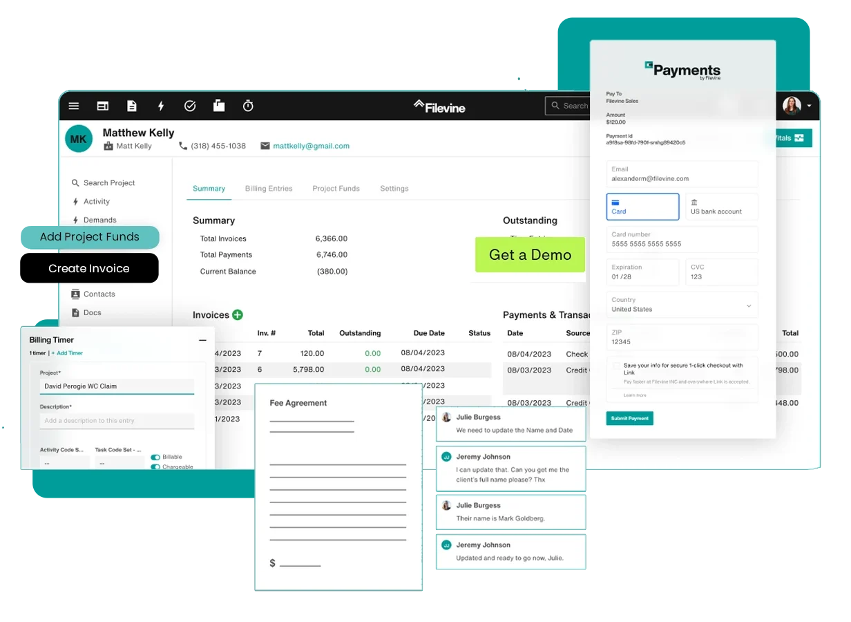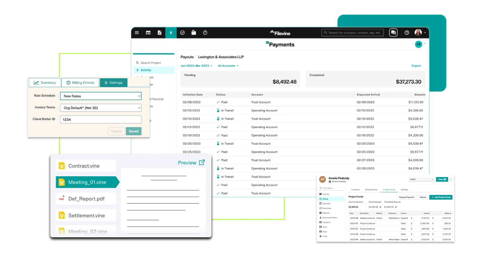 Track time, expenses, and invoices with Filevine’s built-in tools to stay on top of your firm’s financials.